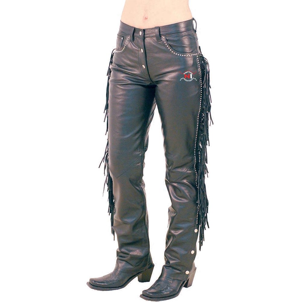 Black fringe western leather pants with studs. Features snap fly and cuffs, wide belt loops, and an extra soft nylon lining. Exclusive.