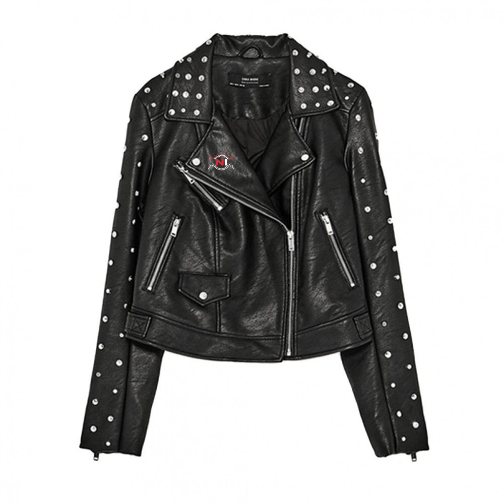 Womens rock chic cropped leather jacket with studs and sugar skull embroidery in the back.